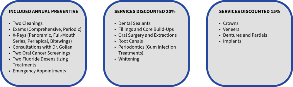 Members receive preventive care including annual exams, cleanings, and x-rays as part of the plan. In addition, members receive UNLIMITED SAVINGS (15-20% off procedures) on everything from cosmetic procedures and implants to fillings and oral surgery!